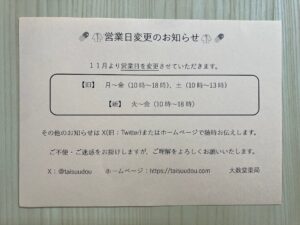 いつもご覧いただきありがとうございます。 9月からたびたび臨時休業をいただいておりましたが、11月より営業日を変更することとなりました。 【旧】 月~金:10:00~18:00、土:10:00~13:00 ⇩ 【新】 火 […]
