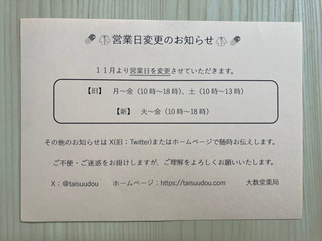 9月からたびたび臨時休業をいただいておりましたが、11月より営業日を変更することとなりました。