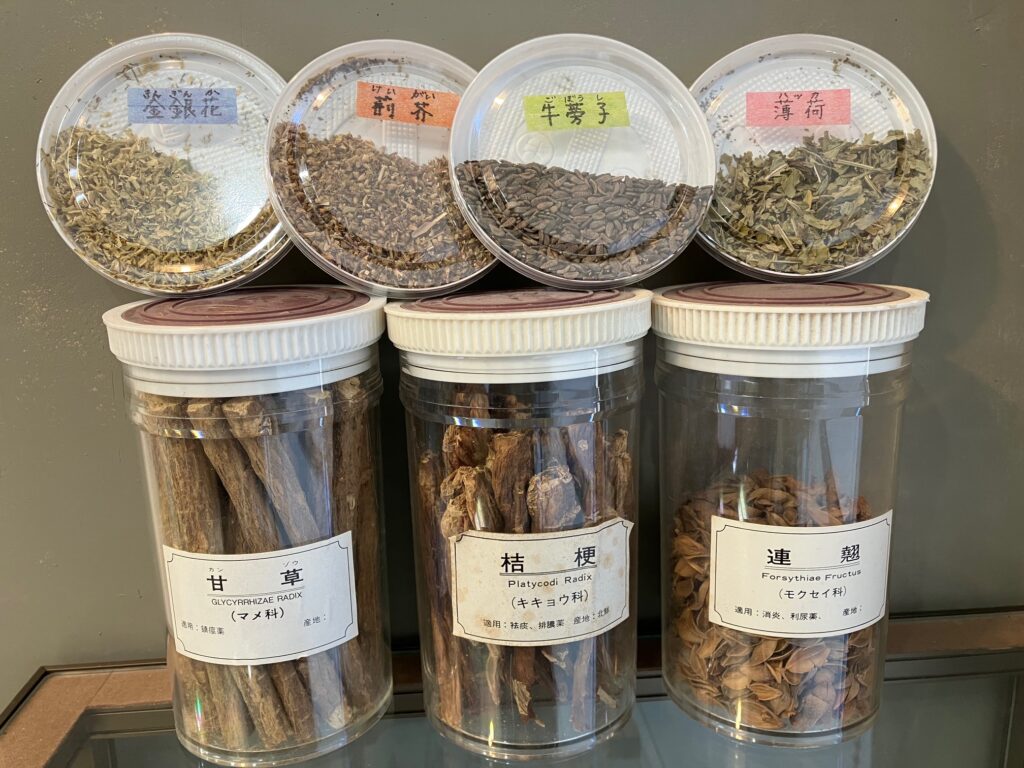 ケイガイ、ゴボウシ、ハッカは解熱鎮痛・消炎効果を持ち、キキョウは鎮咳去痰作用を持っています。カンゾウはいろいろな効果を持っていますが、ここでは抗炎症作用・鎮咳作用を期待し、『桔梗湯』の処方が出来上がります。タンチクヨウは清熱解毒薬、タンズシは他の生薬の効果をサポートし、軽い発汗作用を持っています。