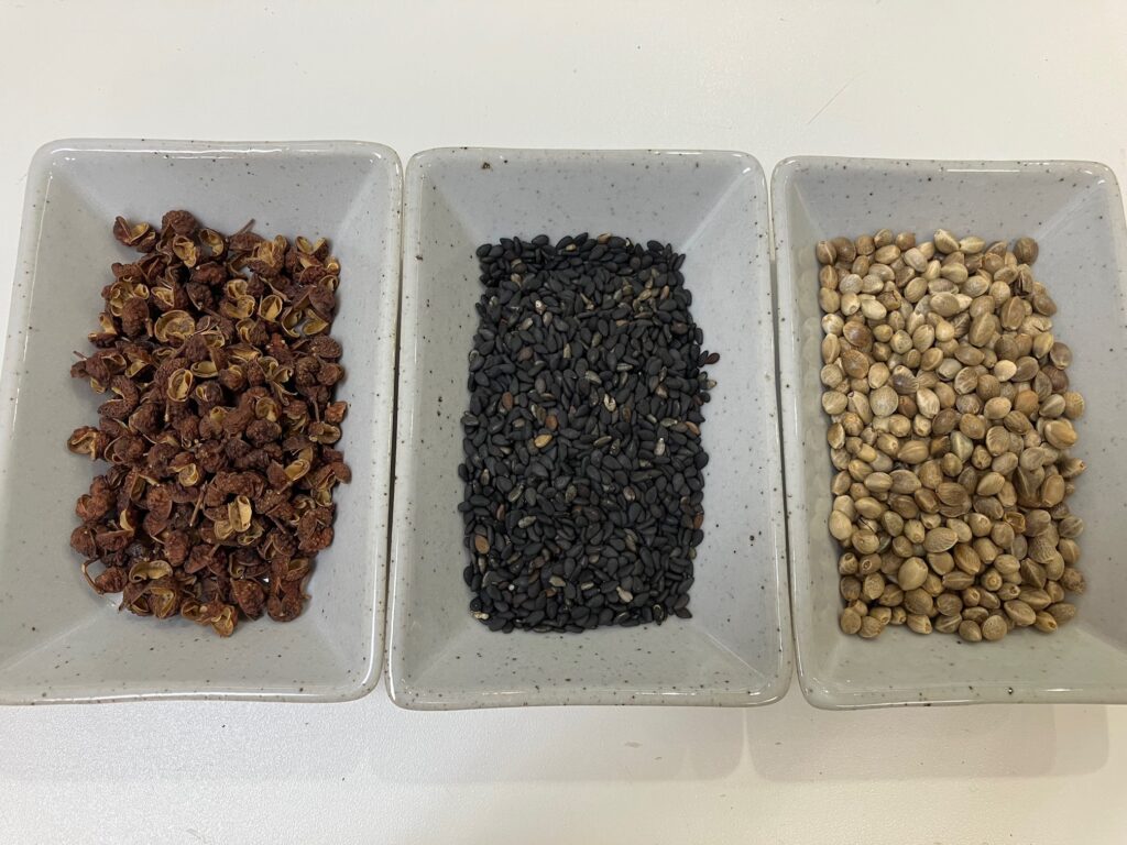 左から、山椒・胡麻・麻子仁。それぞれ、大建中湯・消風散・麻子仁丸などの漢方処方に使われています。唐辛子はさすがに使いませんが・・・もし処方に入っていたら調剤するのが大変な気がします。