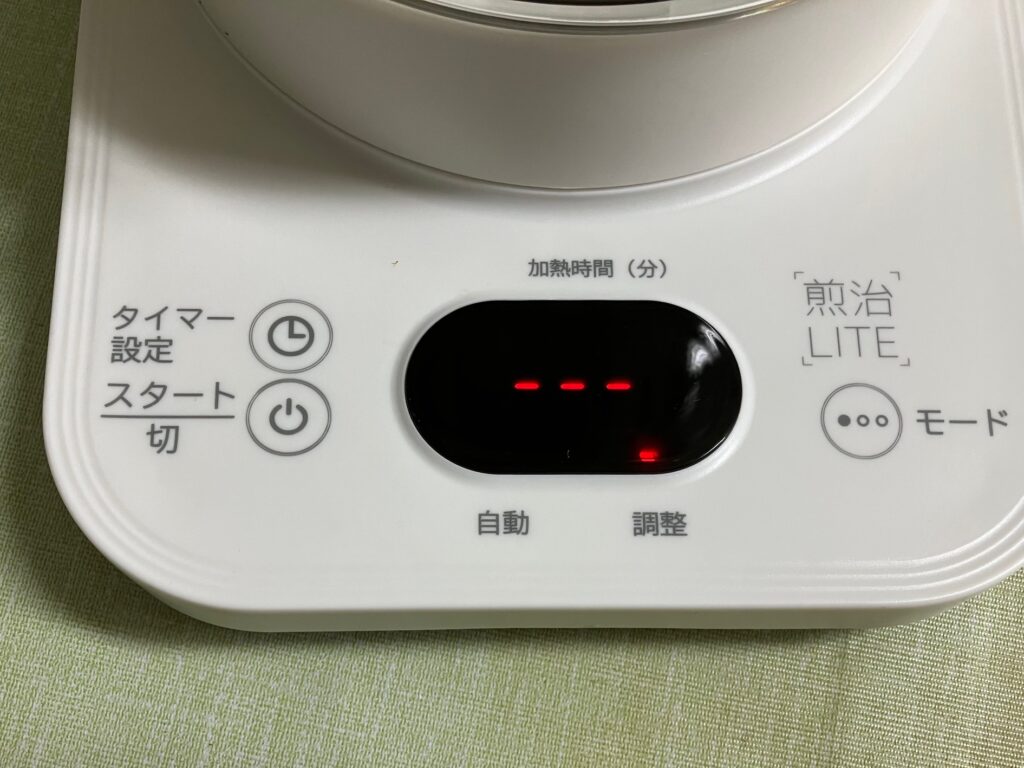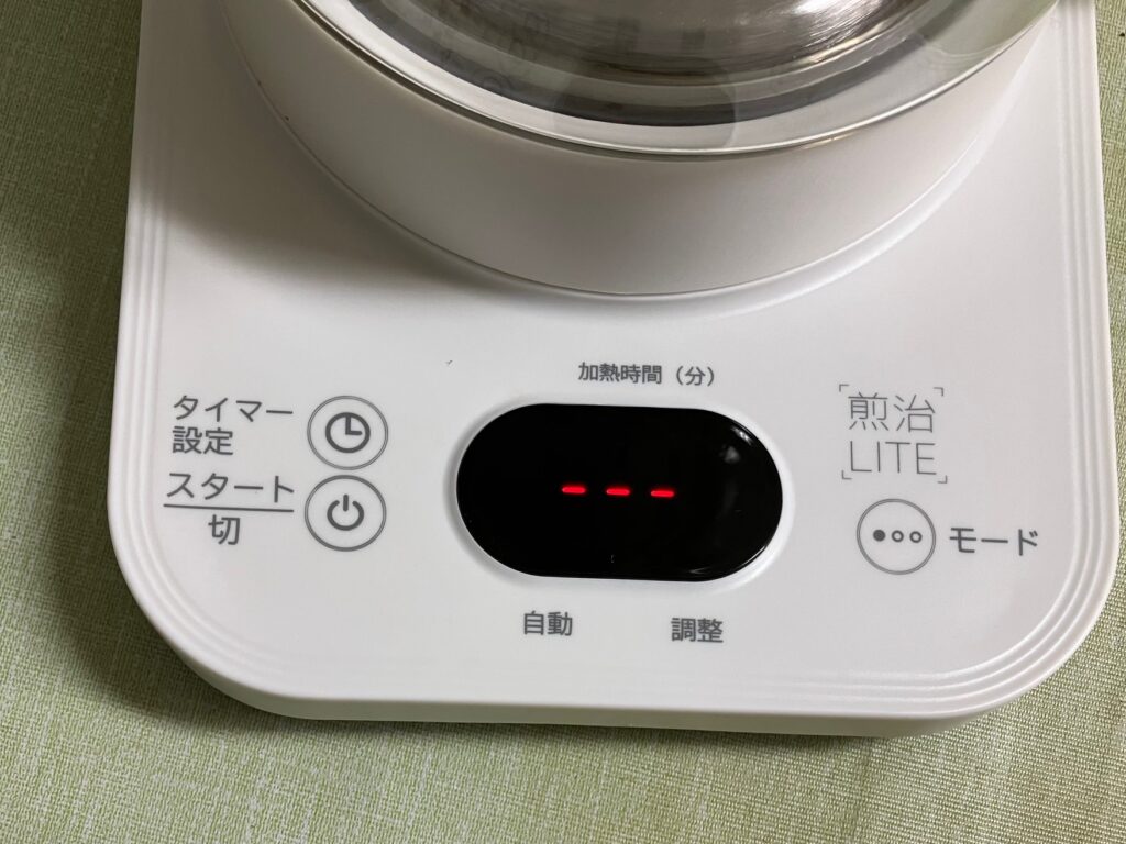 右側の”モードボタン”を押して”自動・調整”の2つのモードを選ぶことができます。自動モードは沸騰後50分煎じる設定になっています。調整モードは左側の”タイマー設定”から最大90分まで設定することができます。(時間調節は10分刻みです。)火力は調節不要です。