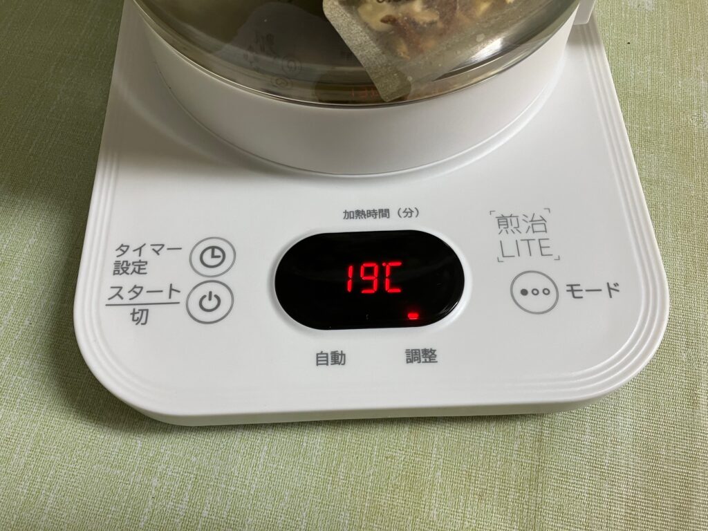 今回は”調整モード”で30分の煎じ時間にしました。スタートボタンを押すと、現在の水温が表示されます。(画像は19℃)