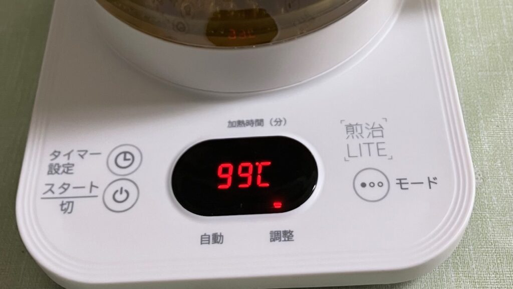 沸騰までは約10分くらいです。水温が100℃になったら設定時間が表示されます。
